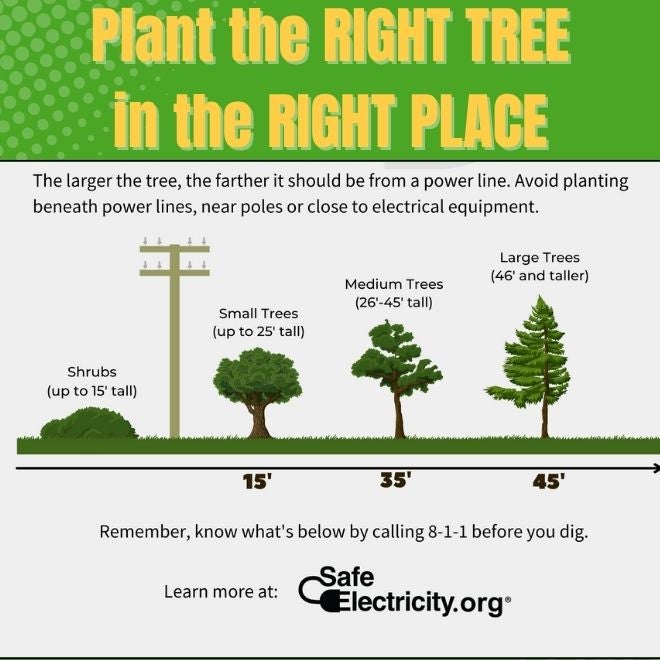 Trees should never be planted directly under power lines, near poles, or too close to electrical equipment.